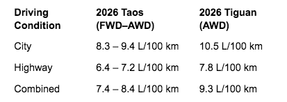 For many buyers, fuel economy is one of the most important factors when choosing a compact SUV. In this department, the 2026 Taos pulls ahead thanks to its efficient powertrain and smaller footprint. According to official ratings, the Taos averages between 7.4 and 8.4 L/100 km combined, depending on whether the model is front-wheel or all-wheel drive.