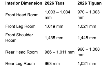 In the front row, dimensions are relatively even, with the Taos offering slightly more headroom while the Tiguan offers marginally more shoulder width. Where the Tiguan really stands out is in the rear legroom, providing a comfortable stretch for taller passengers.