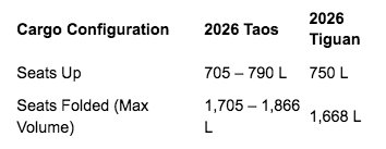 Despite being the smaller SUV, the Taos surprises with a clever cargo layout that maximizes usable volume. With the second row folded, the Taos offers between 1,705 and 1,866 litres of cargo capacity depending on the trim. The Tiguan, although longer overall, provides 1,668 litres in the same configuration.