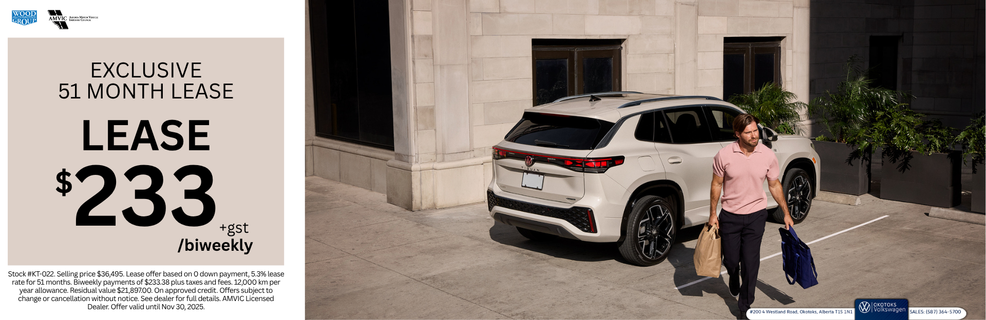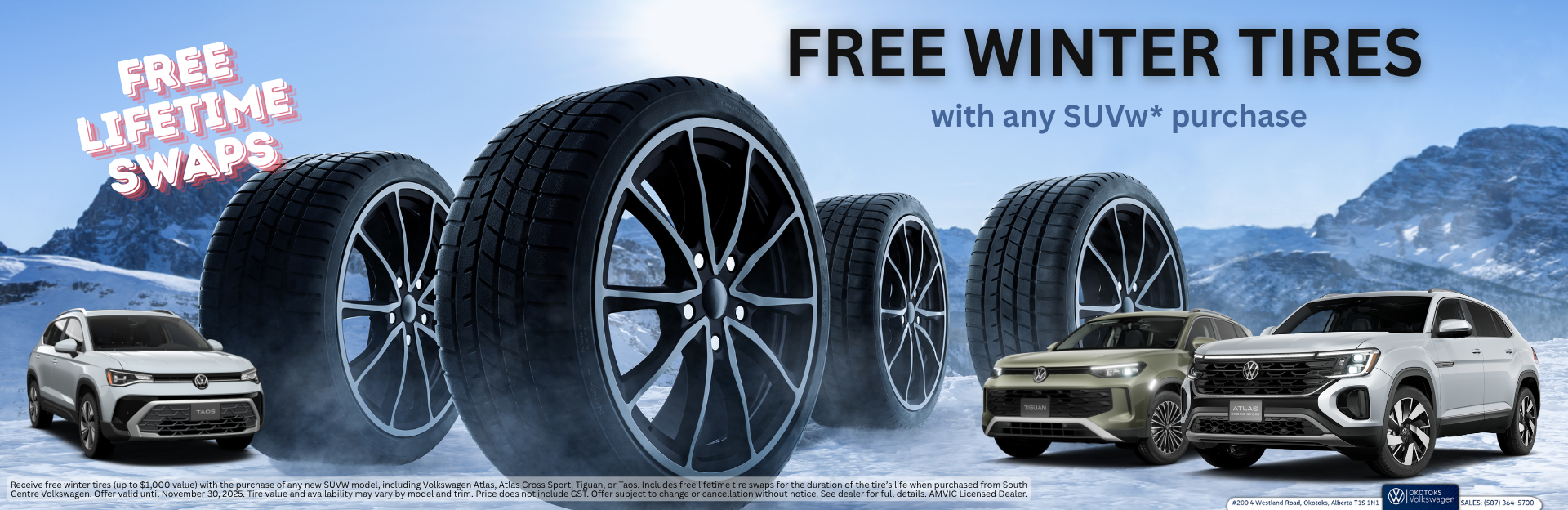 *AMVIC Licensed Dealer. Receive free winter tires (up to $1,000 value) with the purchase of any new SUVW model, including Volkswagen Atlas, Atlas Cross Sport, Tiguan, or Taos. Includes free lifetime tire swaps for the duration of the vehicle’s ownership when purchased from South Centre Volkswagen or Okotoks Volkswagen. Offer valid until November 30, 2025. Tire value and availability may vary by model and trim. Price does not include GST. Offers subject to change or cancellation without notice. See dealer for full details.